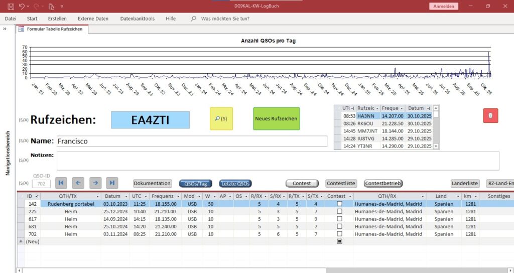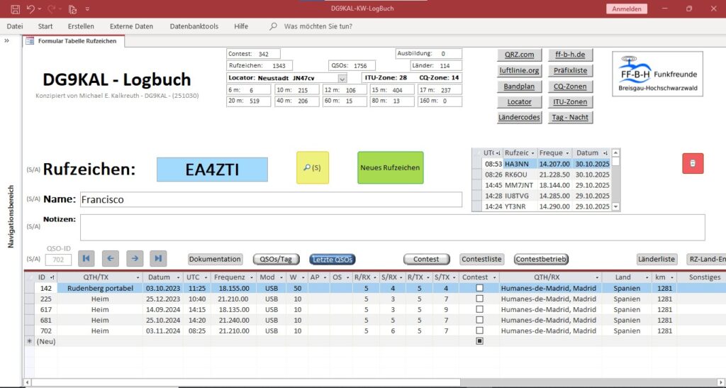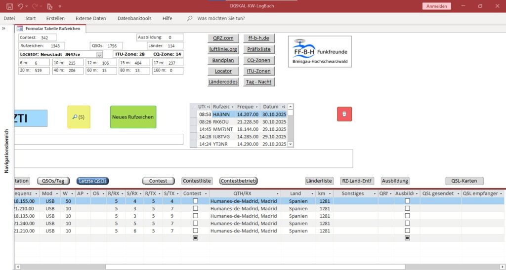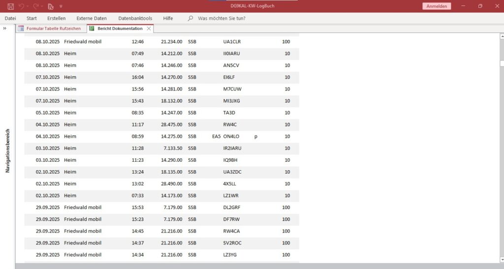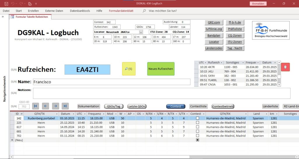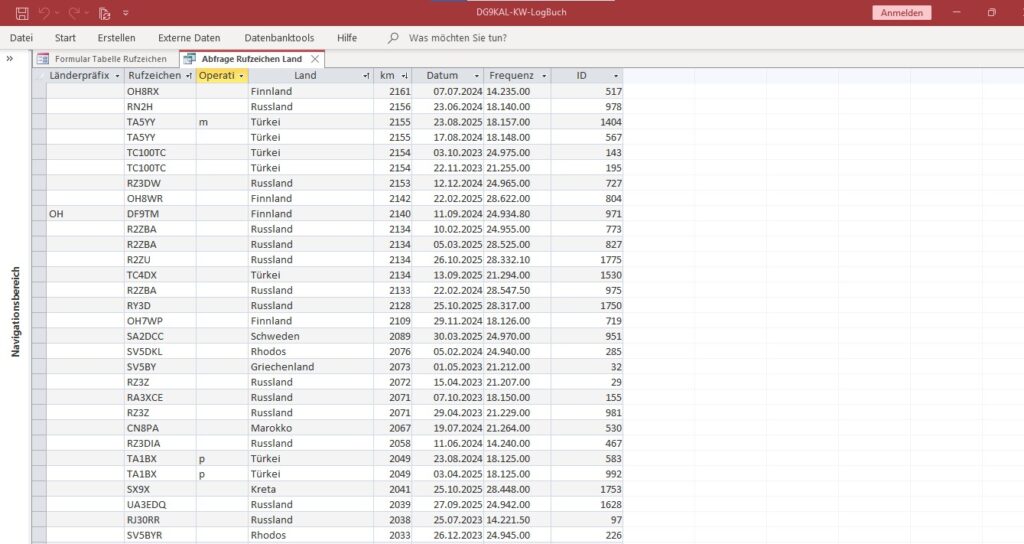 Wer eine kostenlose Kopie meines Logbuches haben möchte, darf mich gerne kontaktieren. Die einzige Bedingung, die Ihr Rechner haben muss, ist die Grundversion von MS-Access ab der Version 2019. Diese kann bei Bedarf für wenige Euro im Netz erstanden werden.